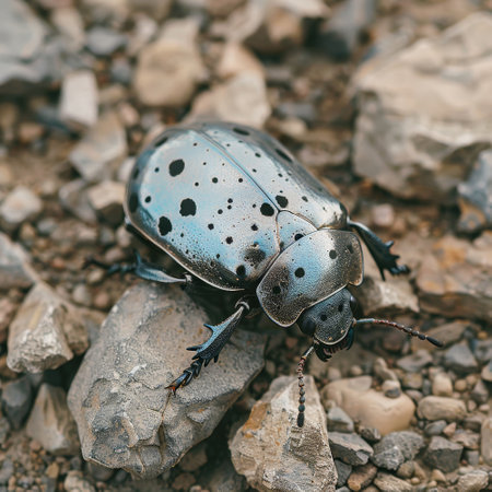 A striking beetle featuring a shiny blue and black body with distinct spots moves across a rocky terrain. The natural environment showcases an array of textures and colors..