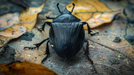 A black beetle moves over fallen leaves in a forest during autumn, showcasing its shiny exoskeleton against the earthy backdrop.