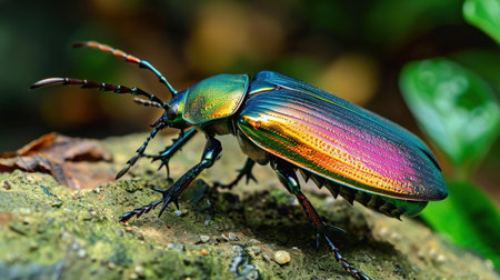 A stunning close-up image of a vibrant beetle showcasing its shiny, iridescent colors while resting on a rock in its natural habitat surrounded by lush greenery.