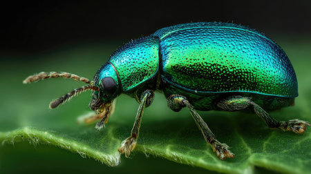 A vibrant beetle perched gracefully on a lush green leaf, showcasing intricate patterns and colors. This close-up captures the essence of nature's beauty and diversity.