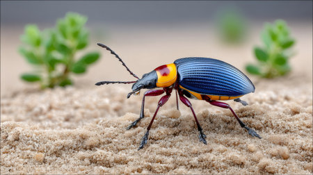 Colorful beetle with blue and yellow markings walking on a sandy surface