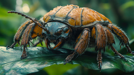 A detailed macro shot of a cockchafer beetle perched on a green leaf in a natural environment, showing its texture and features.