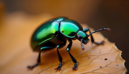 Macro shot of a beetle on a leaf with bokeh background