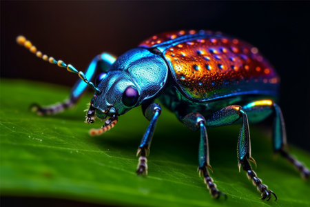 Captivating close-up of a colorful beetle displaying iridescent wings perched on vibrant green leaves, showcasing the beauty of nature's diversity and intricate details.