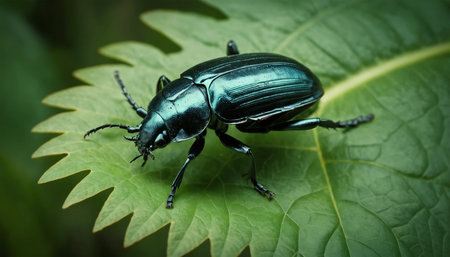 Black beetle perched on vibrant leaves, showcasing intricate details and textures. Nature and entomology concept with green background.