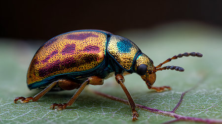 A close-up of a colorful beetle crawling on a green leaf, with intricate details of its shell and the leaf's texture clearly visible, set against a blurred background.