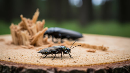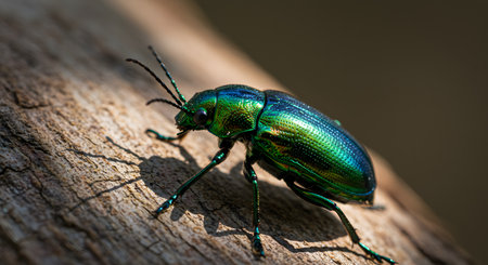 A detailed view of a beetle crawling on a tree bark, highlighting its shiny shell and the rough texture of the wood in the background