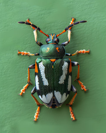 Macro Shot of Colorful Beetle with Distinctive Patterns and Textured Green Background Highlighting Insect's Detailed Anatomy and Vibrant Colors AI Generative