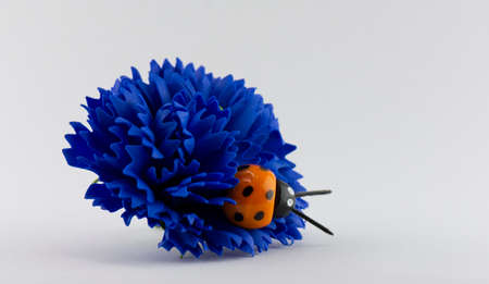 A toy ladybug on a tree eats mold. A figurine of a bug on a tree crown.