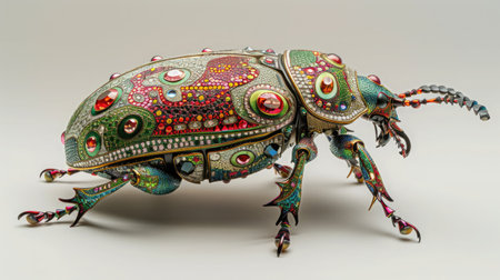 Bright, shimmering beetles with glowing hues and detailed surface patterns cast striking reflections against a neutral backdrop.