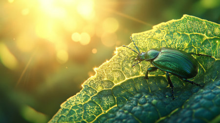 A stunning close-up of a vibrant green beetle perched on a leafy surface, illuminated by gentle sunlight, showcasing intricate details of nature.