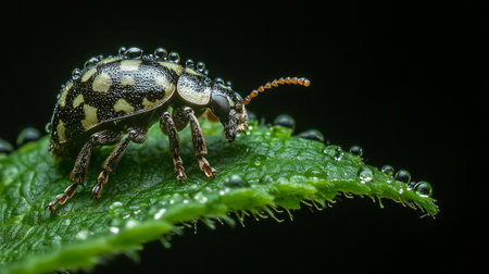 Black beetle perched on vibrant leaves, showcasing intricate details and textures. Nature and entomology concept with green background.