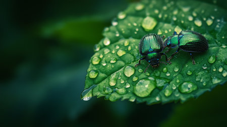 A pair of beetles on a dew-drenched leaf, their shiny bodies reflecting the morning light, surrounded by lush greenery, creating a natural and dynamic scene.