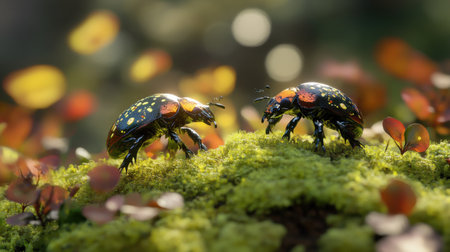 Two colorful beetles are actively exploring a lush patch of moss in a vibrant forest. Sunlight filters through leaves, creating a magical atmosphere filled with natural serenity.