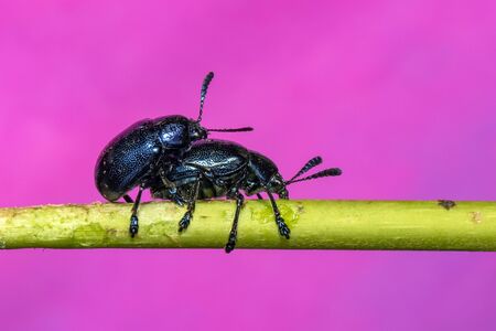 Image of blue milkweed beetle(Chrysochus pulcher) are mating on the branches on a pink