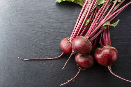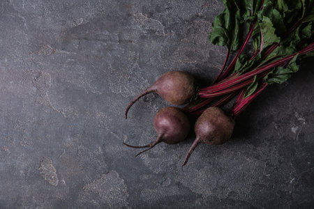 Young beetroot on a gray stone or slate background. Top view with copy space.