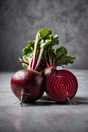 A close-up image showing two whole beetroot bulbs and one sliced beetroot, revealing its intricate red and white patterns. The beetroots are accompanied by their fresh green leaves, adding a vibrant touch to the composition. The image is set against a subtle gray backdrop, highlighting the natural beauty of the beetroot.