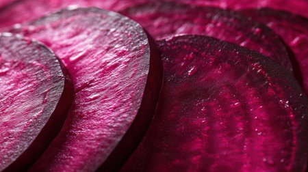 Detailed macro shot of fresh, vibrant red beet slices, highlighting the smooth texture and circular patterns of the vegetable.
