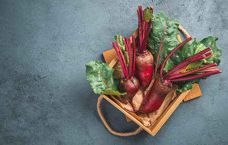 Young beetroot in a wooden box on a gray-blue background. Top view, copy space.