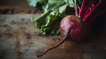 A close up 3D render of a fresh beet with vibrant green leaves. sitting on a wooden table. Perfect for showcasing healthy eating. organic food. and kitchen designs.
