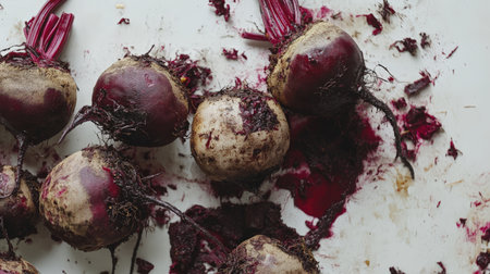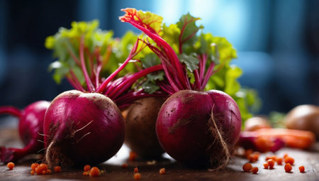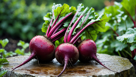 AI Generated. Fresh beets with dew drops on stone slab in garden vibrant colors and natural beauty