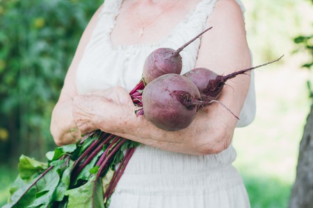 Portrait of an elderly woman in a hat holding a beets. Toning. Selective focus.