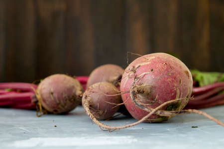 fresh beetroot on wooden surface. Fresh picked organic beetroot on old rustic wooden board. Fresh organic beet vegetable on rustic wooden background. detox and diet food.
