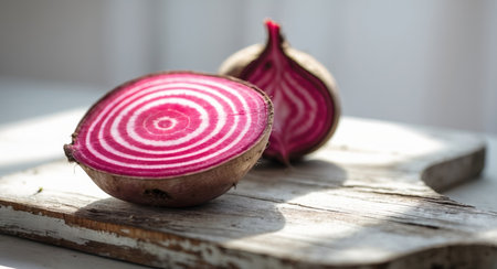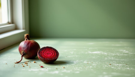 Fresh Red Beetroot Cut Half on Kitchen Table with Natural Light Highlighting Textures and Colors on Soft Green Background