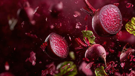 Flying red beets in dark burgundy background ,showcasing fruit and vegetables levitating
