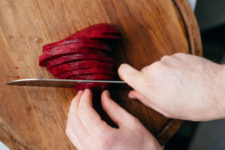 the process of cutting beets on a wooden board