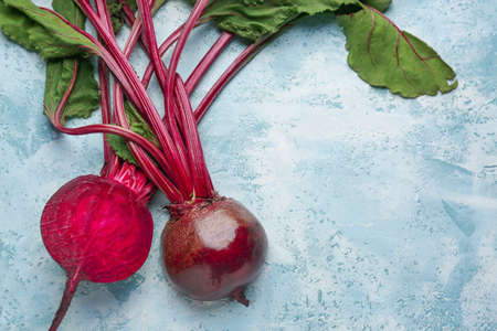 Fresh organic farmer raw beets with leaves on a white marble kitchen table. Top view copy space