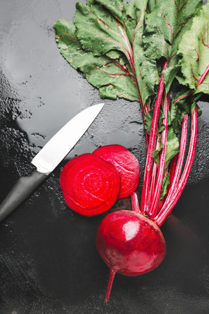 Fresh beets with knife on dark background