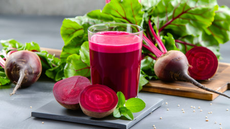Glass of beetroot juice with fresh organic beetroots on a gray background promoting healthy lifestyle