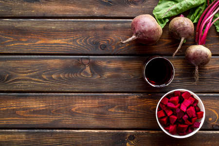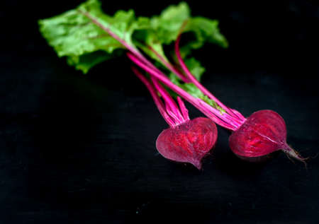 Pair of beetroots on dark background. Black wooden desk table surface.