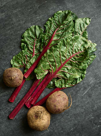 Raw beetroot with herbage leaves on a dark background. banner, menu, recipe place for text, top view.