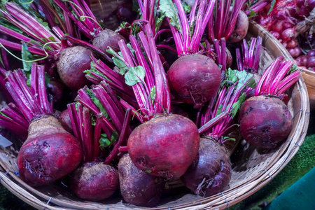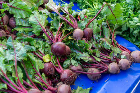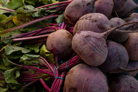 Farmer market in Nafplio, Greece, new harvest of red beetroot vegetable, fresh and healthy organic food close up