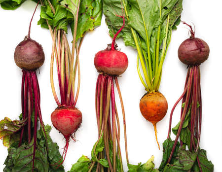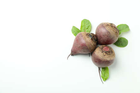 Red beets, still attached to their lush green leaves, display a striking contrast against a bright white background, showing the beauty of fresh produce.