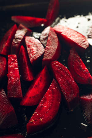 Mix of red and gold beets on grey background. Food background. Concept of healthy eating. Toned image. Horizontal