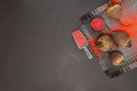 beetroot flour on a black background top view flat lay. Place for text, copy spac