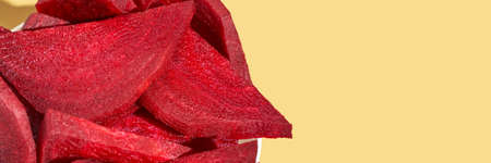 Crispy dried food preparation. Organic tasty chips. Homemade snacks. Sliced beetfood. Healthy vegetables. Trend natural slice. Horizontal banner. Copyspace
