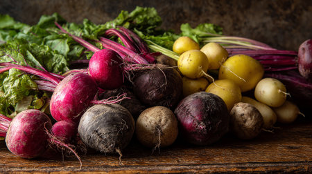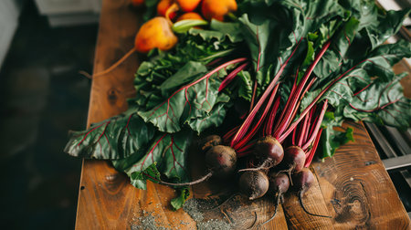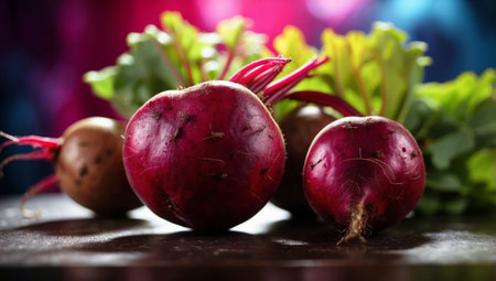 Nourishing Beetroot harvest green on wooden table. Raw nature market. Generate Ai
