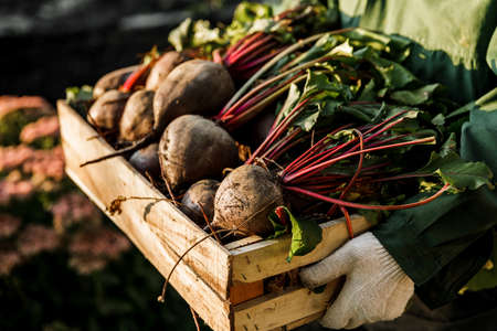 A man farmer holds a harvest of beets in his hands. Selective focus. Food.