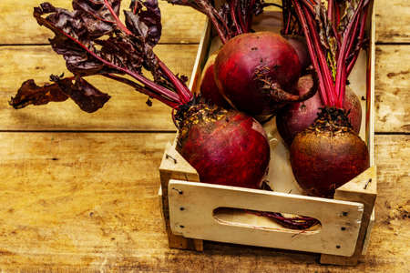 Fresh homegrown beetroot with leaves in crate. Healthy plant based food, local produce harvest, vintage wooden boards table, close up