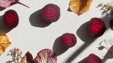 Bright red beetroot slices lay on a white surface, showcasing their intricate patterns. Surrounding the beetroots are colorful autumn leaves and fragile herbs, creating a seasonal ambiance.