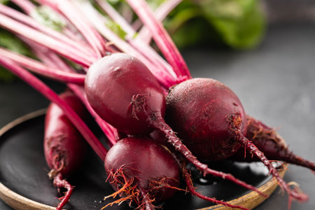 Fresh homegrown beetroot with leaves on black stone concrete background. Healthy plant based food, local produce harvest, top view