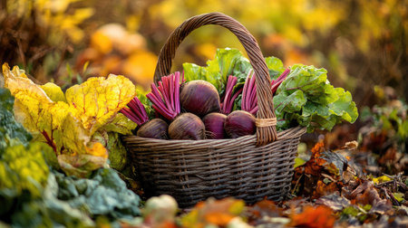 A farmer's basket filled with freshly dug beets, placed among other autumn harvest vegetables.