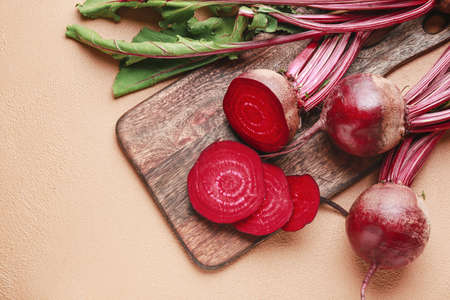 Product photography of beets in bunch on a wooden table. Play of light and shadow. High quality photo