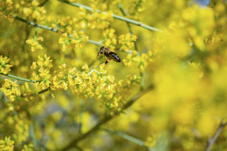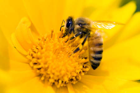 Bee collecting pollen at yellow flower. Bee flying over the yellow flower in blur background