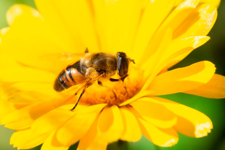 Hoverfly Syrphidae is a useful garden insect on a yellow flower. selective focus, macro.