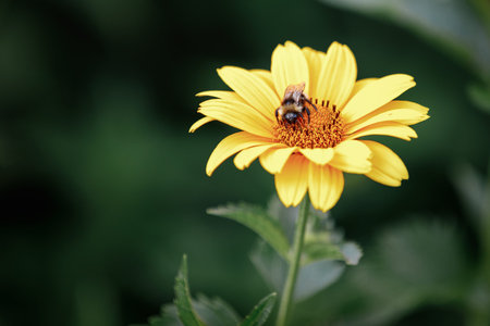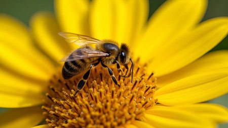 Beautiful honey bee sitting on a vibrant yellow flower in a wild nature landscape. Perfect for spring and summer designs, banners, and celebrating the beauty of nature.